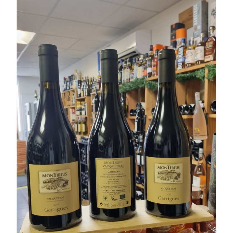 La Cuvée Garrigues Vacqueyras Rouge 2015 du Domaine Montirius est un vin biodynamique composé de Grenache et Syrah. Il offre des arômes de fruits noirs, de réglisse et d’épices, avec une structure tannique élégante et une bouche ronde. Ce vin, puissant et complexe, se distingue par sa fraîcheur et sa longue finale, idéal avec des viandes grillées ou des fromages affinés.