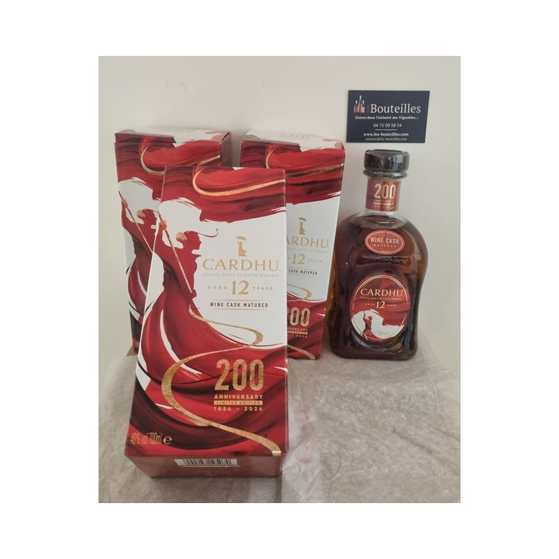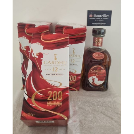 Le Cardhu 12 ans Wine Cask 200th Anniversary est un whisky écossais single malt de Speyside, vieilli en fûts ayant contenu du vin. Cette édition spéciale célèbre les 200 ans de la distillerie. Il offre un nez fruité, avec des arômes de fruits rouges et de vanille, et une bouche douce et veloutée, avec des notes de raisins secs et d'épices. Idéal à déguster seul ou accompagné de chocolat noir.