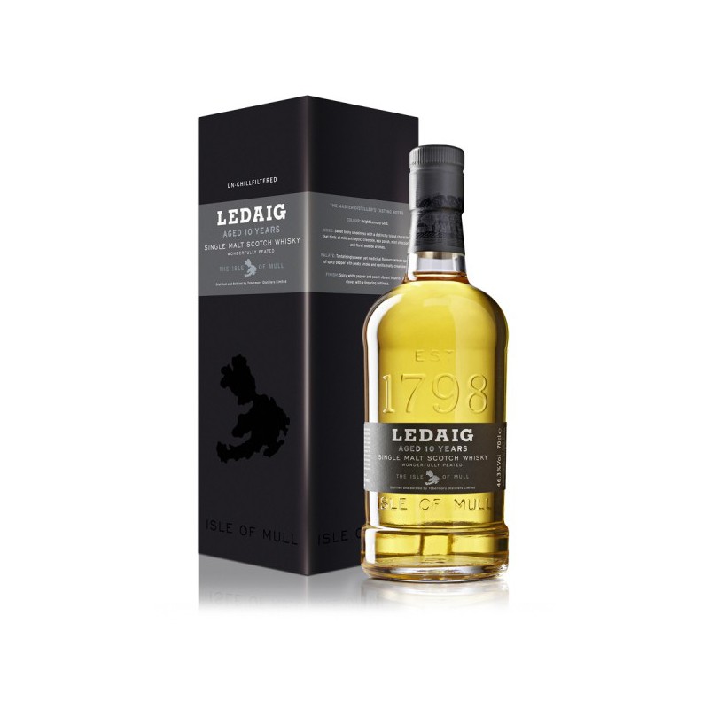 Le Ledaig 10 ans est un whisky single malt écossais, issu de l'île de Mull. Il est vieilli pendant 10 ans en fûts de chêne ayant contenu des whiskies bourbon et sherry, ce qui lui confère une complexité unique. Avec des arômes marins, tourbés et épicés, il offre une bouche riche, sucrée et légèrement fruitée, suivie d'une finale longue et subtilement tourbée.
